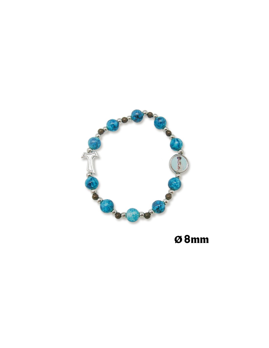 Pulsera Brazalete Elastica 8Mm Cristal Azul Y Blanco Con Tau Y Bolitas Madera