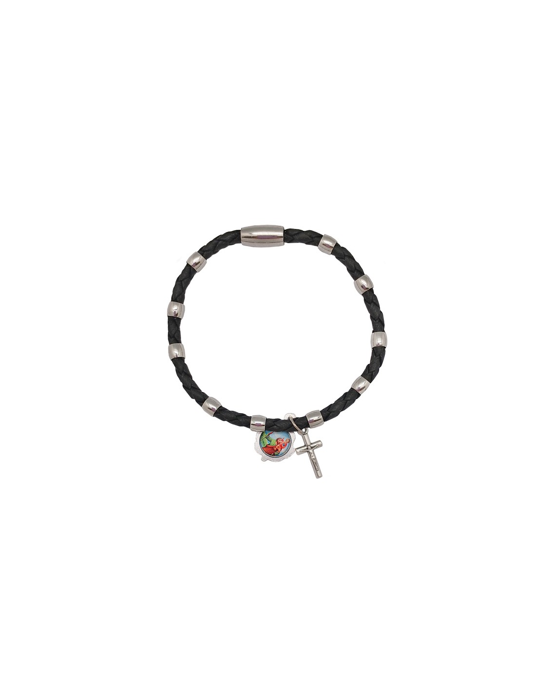 Pulsera Cuero Trenzado Negro Con Adornos Metal Y Cierre Magnetico