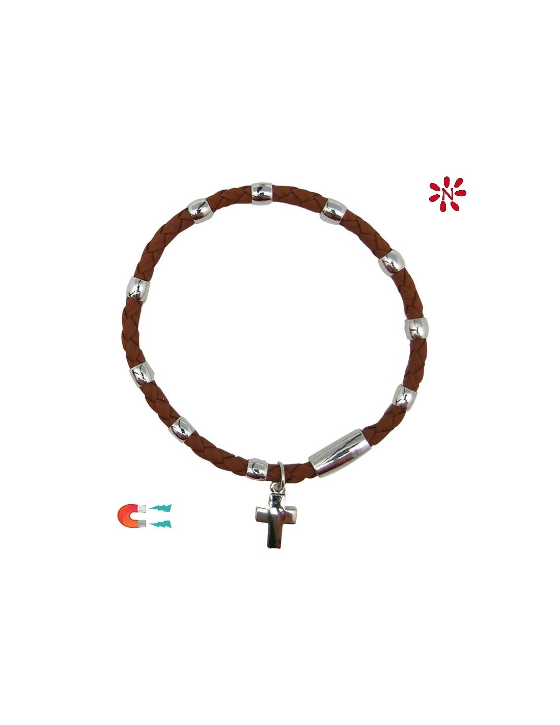 Pulsera Cuero Trenzado Marron Con Adornos Metal Y Cierre Magnetico