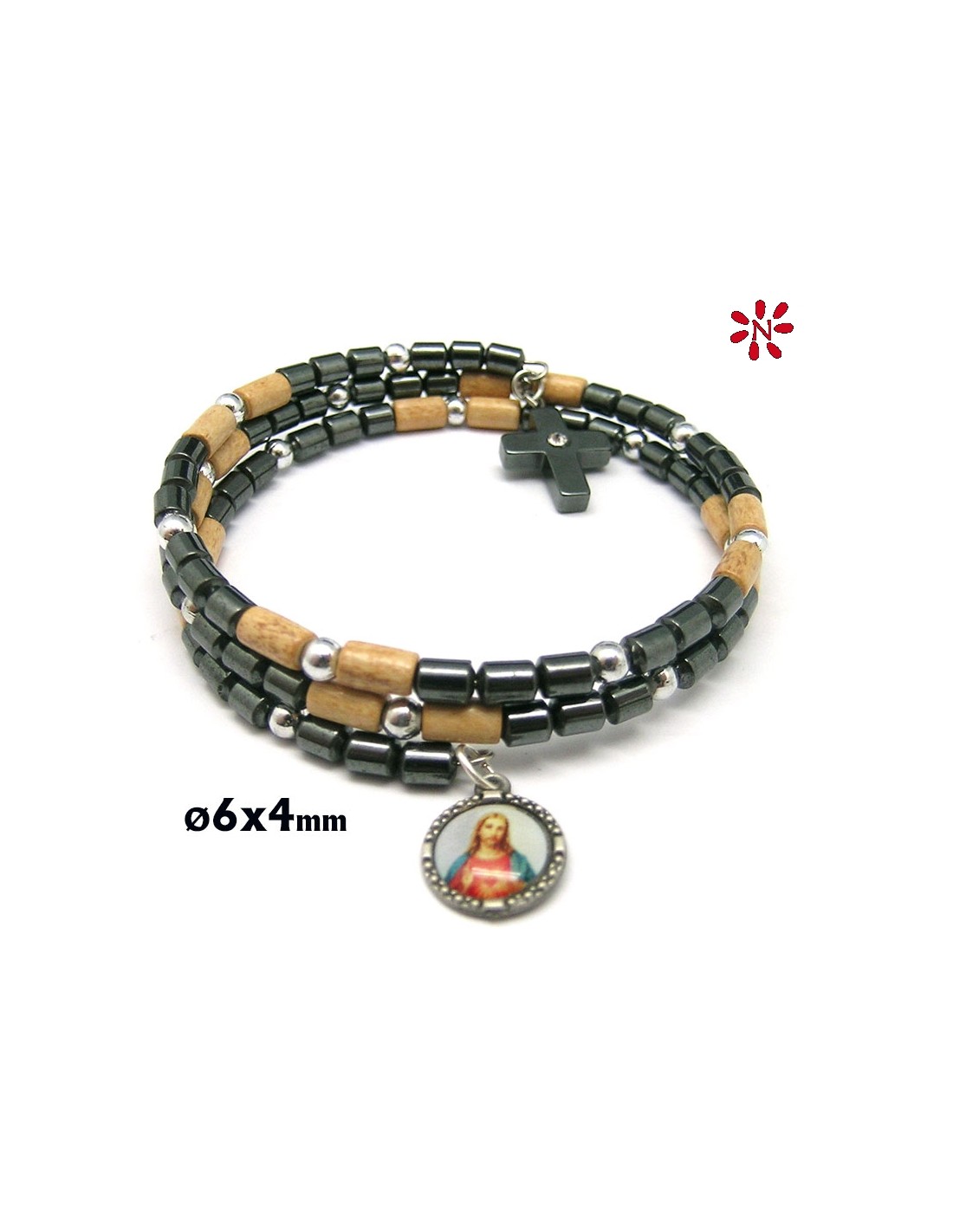 Pulsera Espiral Ematite Cilindro Y Madera 6X4mm Con Cruz Ematite