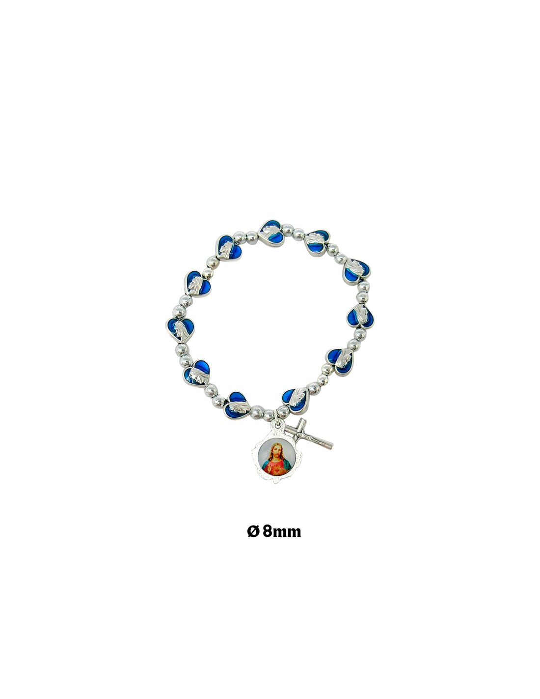 Pulsera Elastica Plateada Cuentas Corazones Con Virgen En Azul Personalizable