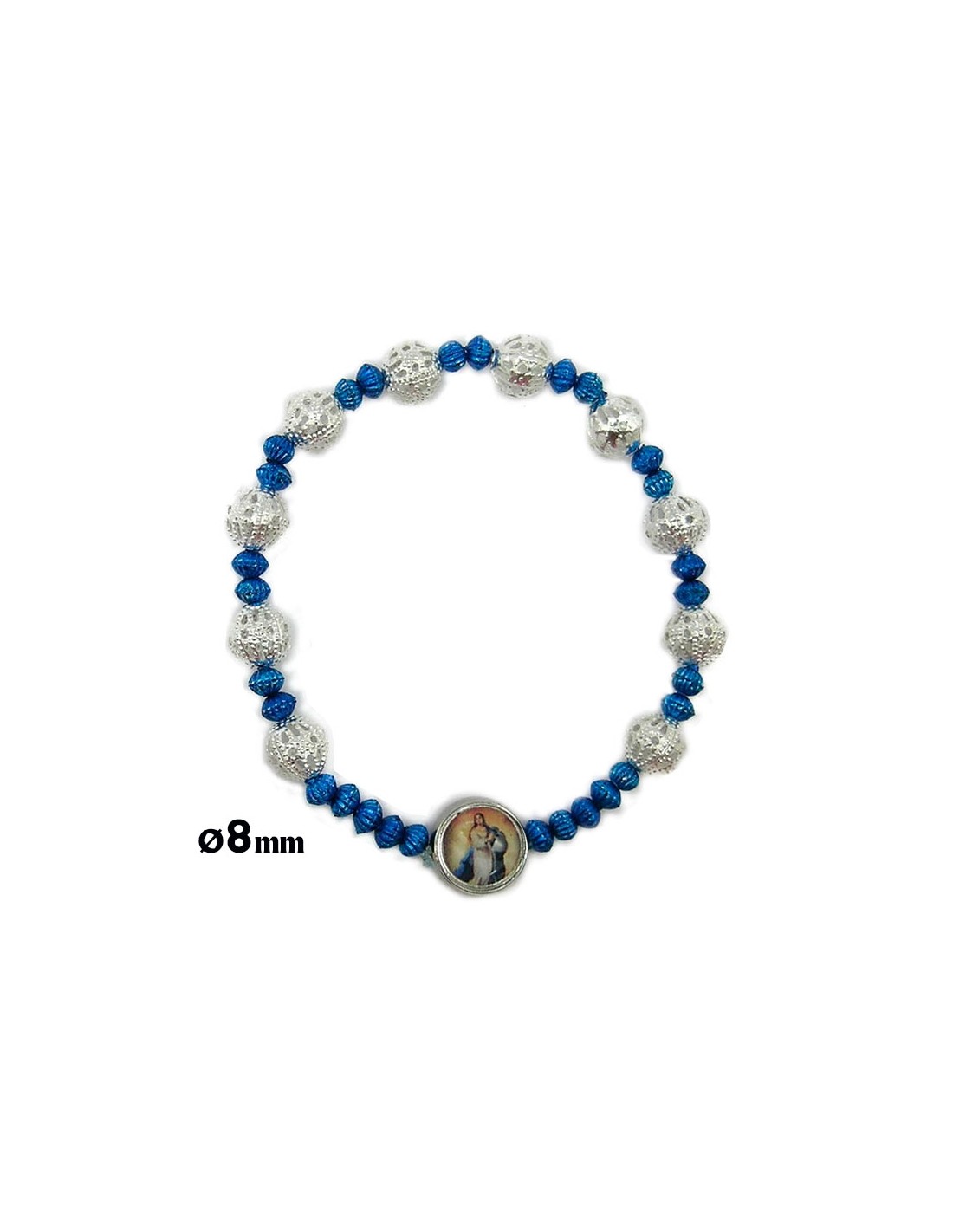Pulsera Elastica Plateada Cuentas Corazones Con Virgen En Azul Personalizable