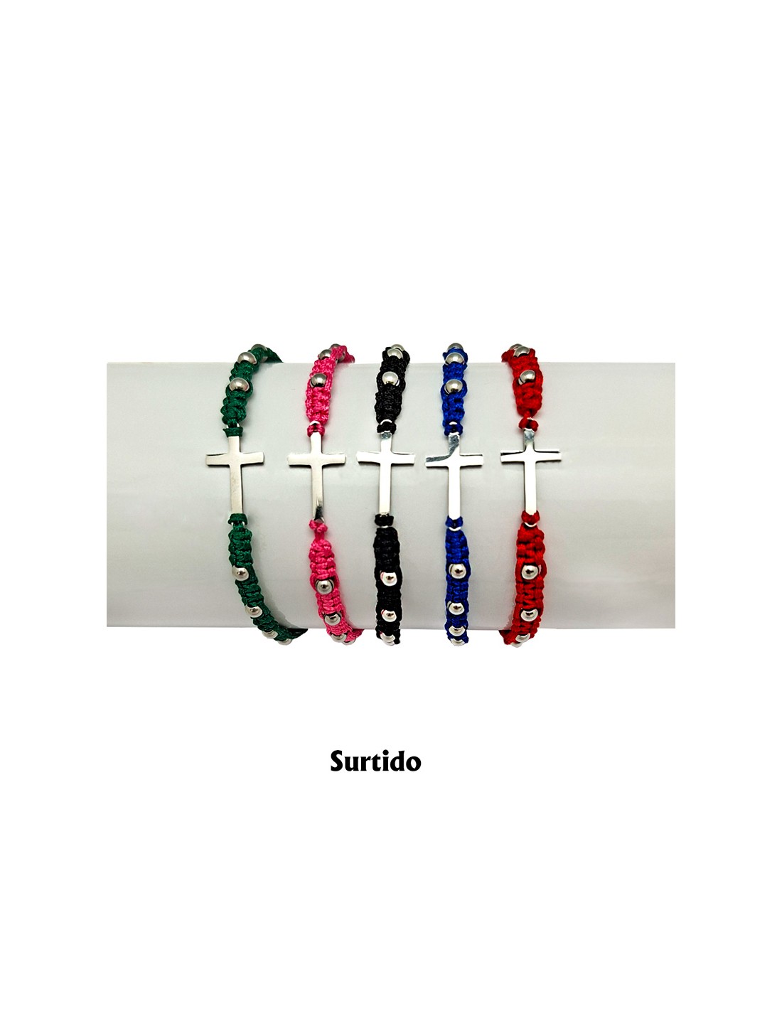 Pulsera Cuerda Trenzada Con Cruz Central Acero Y Bolitas Colores Surtidos