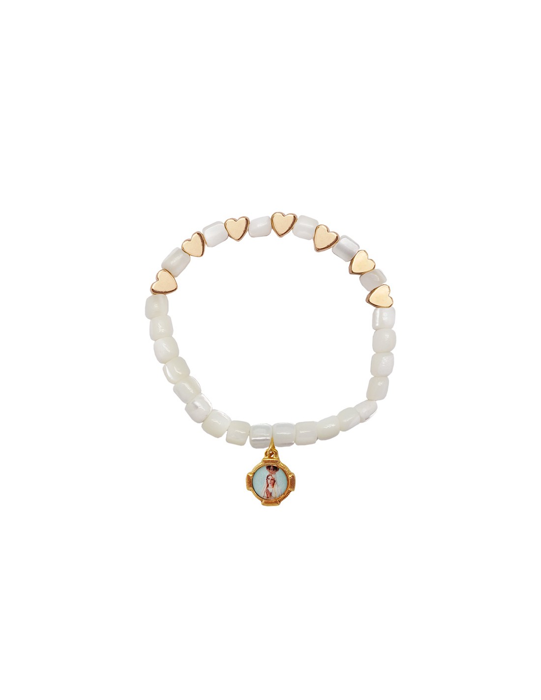 Pulsera Elastica Tubos Nacar 6Mm Con Corazones Dorados