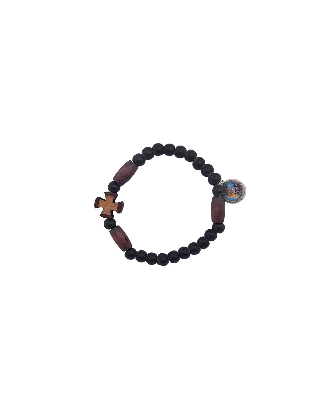 Pulsera Elastica Madera 6Mm Negra Con 3 Tubos Alargados Y Cruz Dos Tonos
