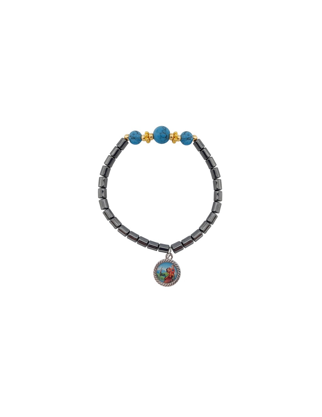 Pulsera Elastica Hematite Tubos 6X4mm Con 3 Bolas Turquesa Y Adornos Dorados