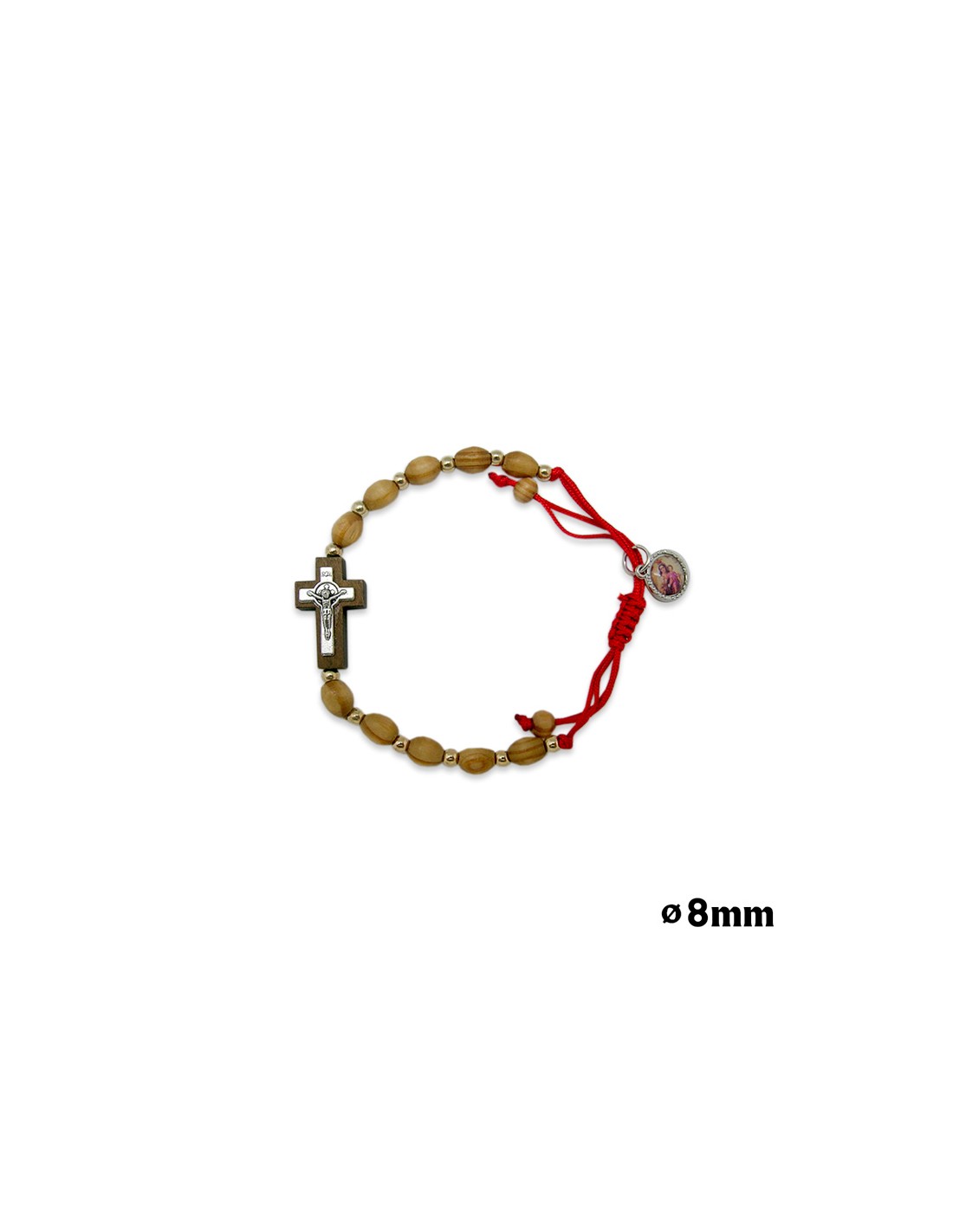 Pulsera Cuerda Roja Madera Clara Oval 6X4mm Con Cruz Doble Y Bolitas Doradas