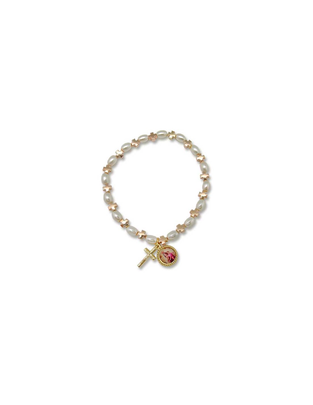 Pulsera Dorada Bola Oval Imitacion Nacar Con Cruces