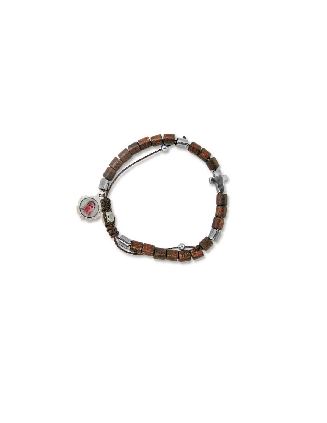 Pulsera Madera Ajustable Marron Bolas Cilindro Con Adorno Metal Y Cruz