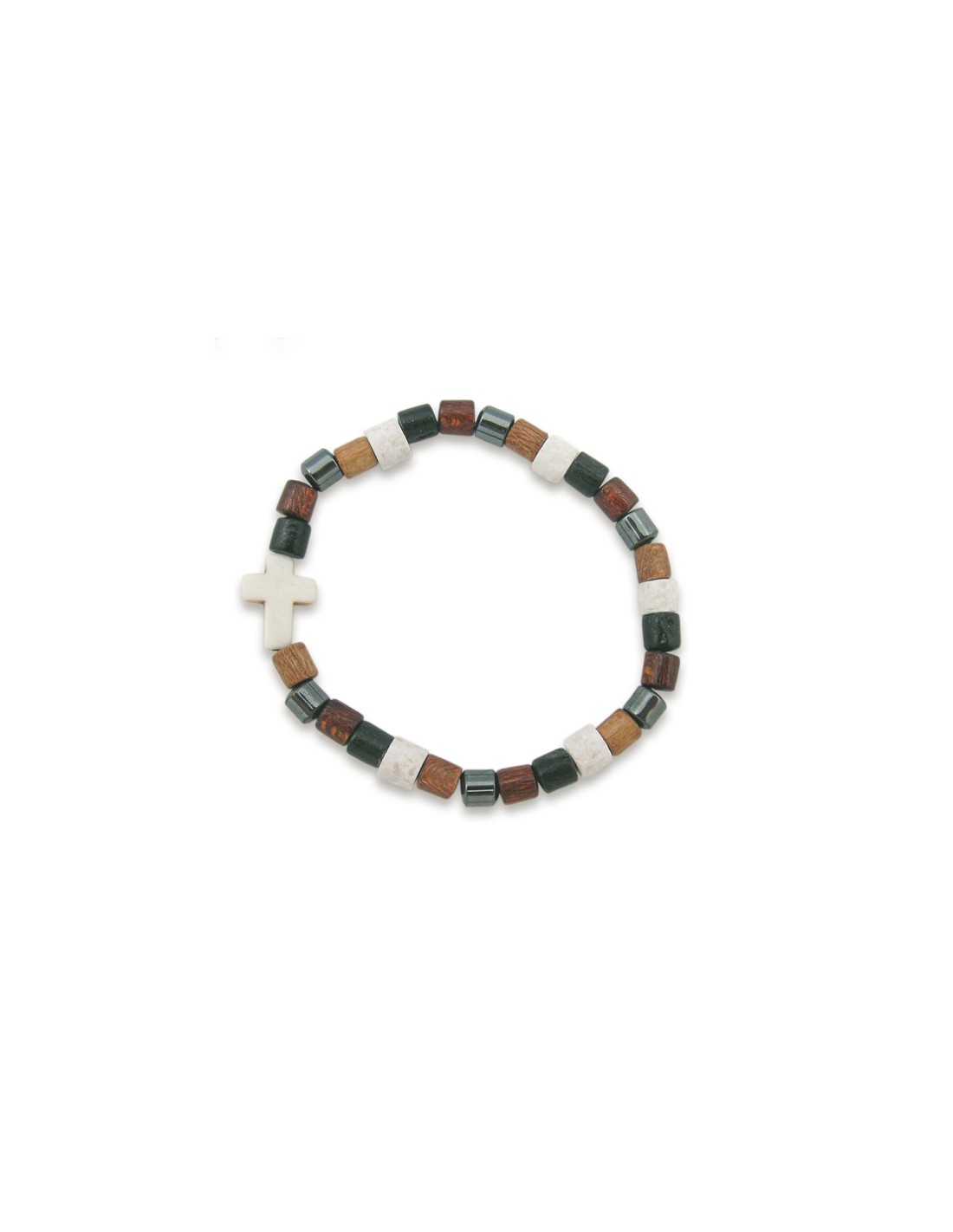 Pulsera Piedra Y Madera Elastica Multicolor Cilindro Con Cruz