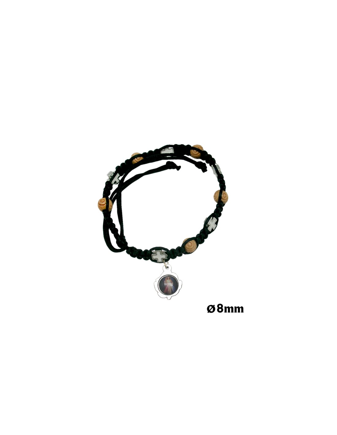 Pulsera Cuerda Negra Con Madera 6Mm Y Cruces Con Esmalte Blanco