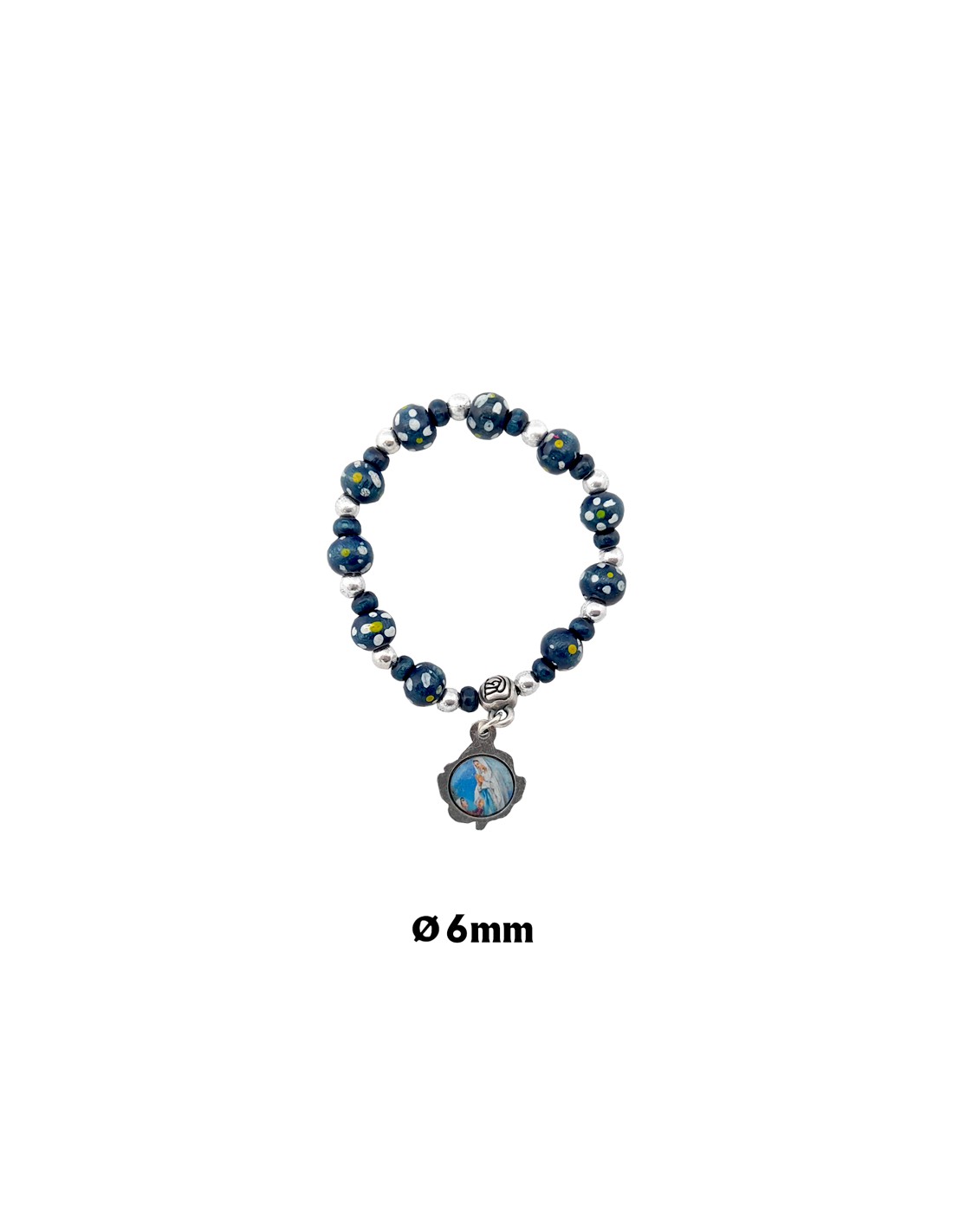 Pulsera Elastica Infantil Madera 6Mm Azul Y Flores Blancas Con Bolitas Plateadas
