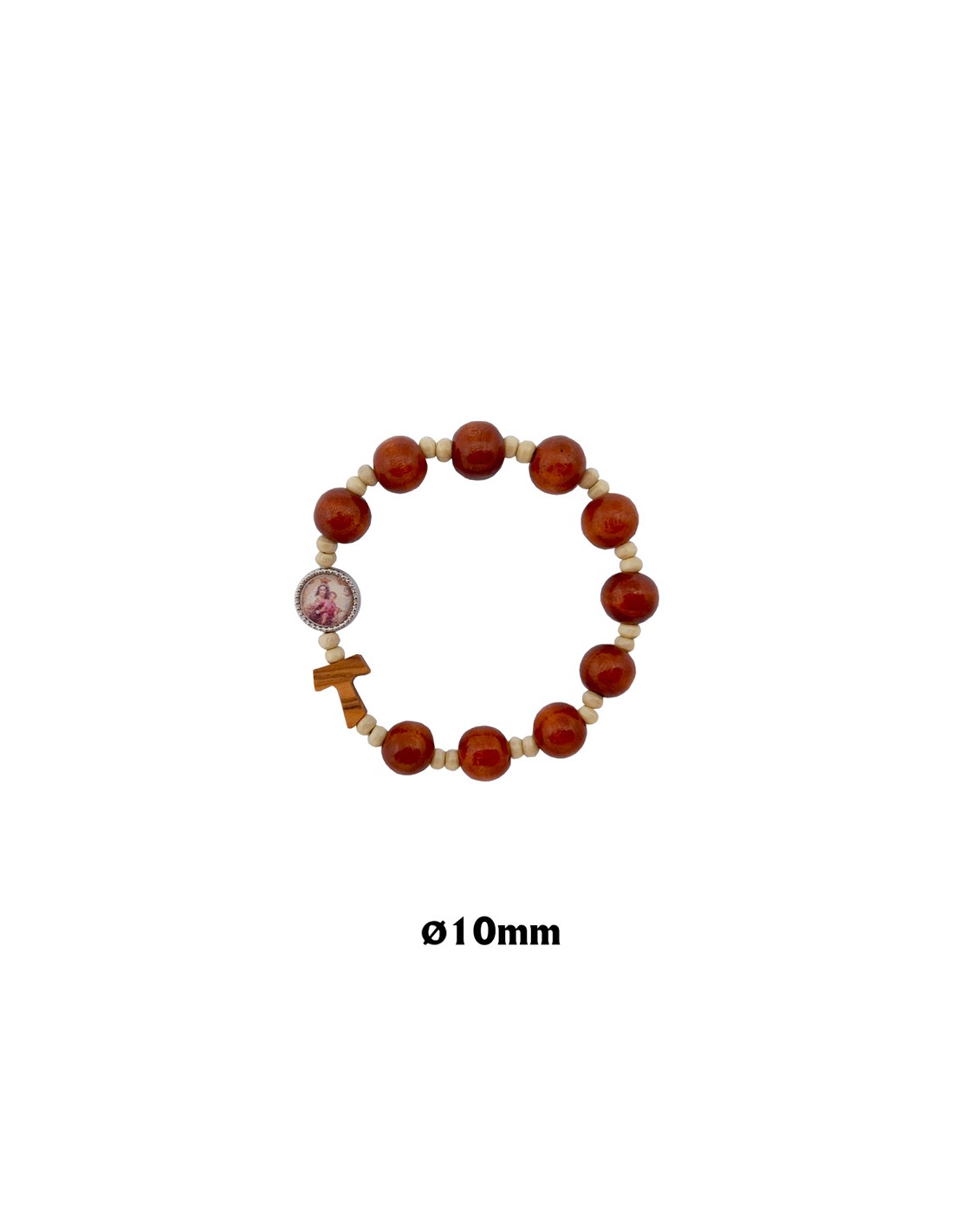 Pulsera Elastica Madera 10Mm Marron Con Bolitas Blancas Y Cruz Tau