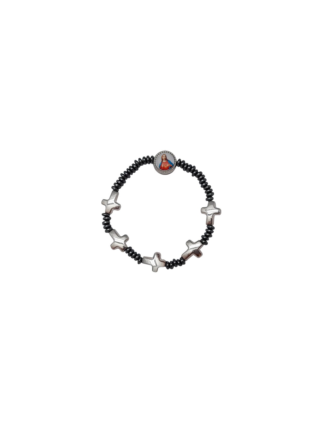 Pulsera Elastica Ematite Discos 4Mm Con 5 Cruces De Metal