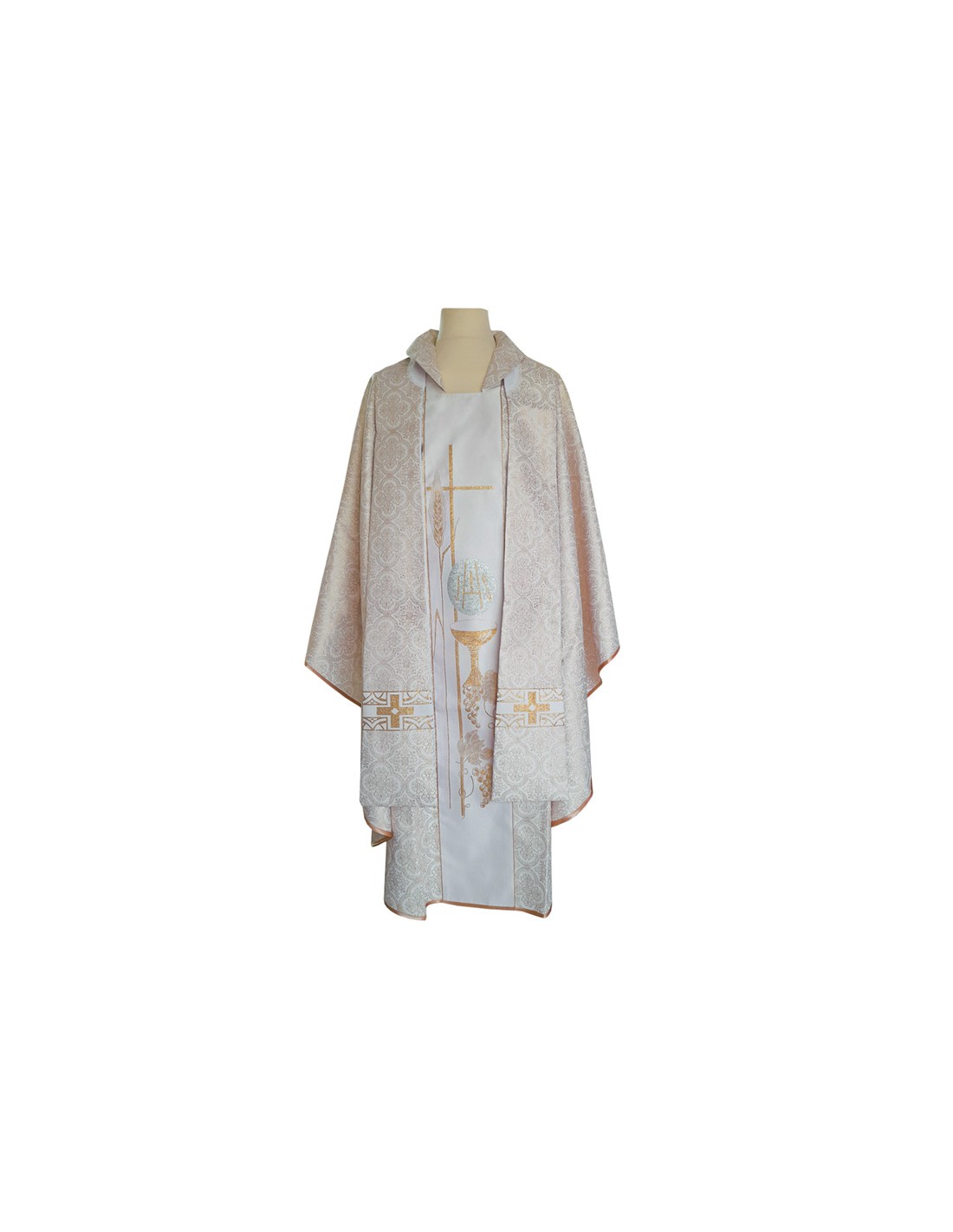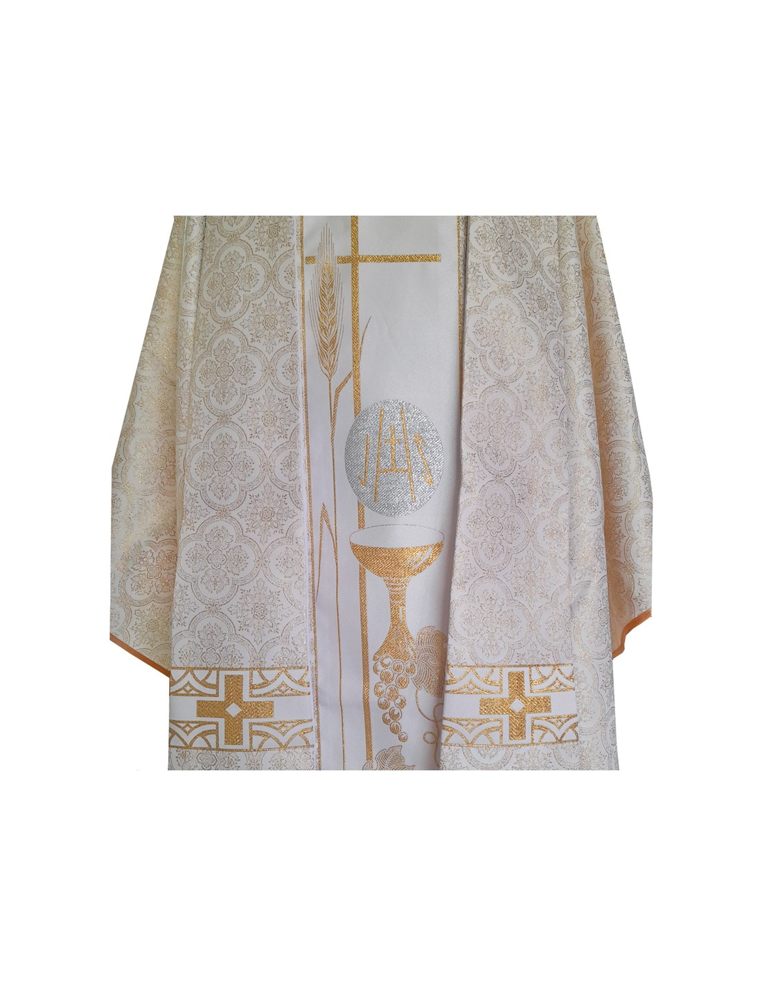Casulla Estampada Tipo Damasco Con Galon Cruz Y Espiga Fina Caliz Y Forma N375 Blanca