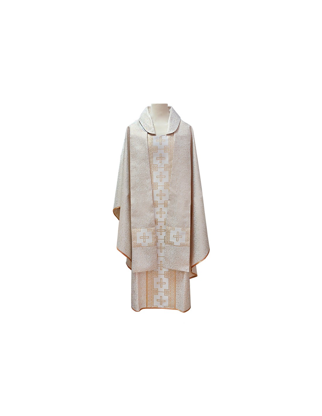 Casulla Estampada Tipo Damasco Con Galon Greca Romana N376 Blanca