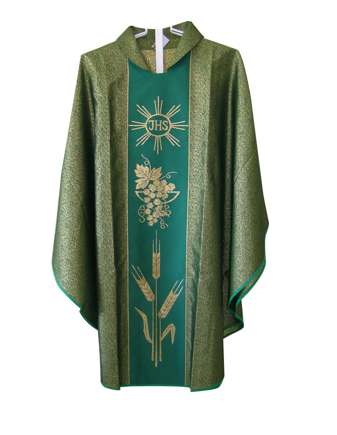 Casulla Estampada Tipo Damasco Con Galon Sol Con Ihs Racima Espigas N378 Verde