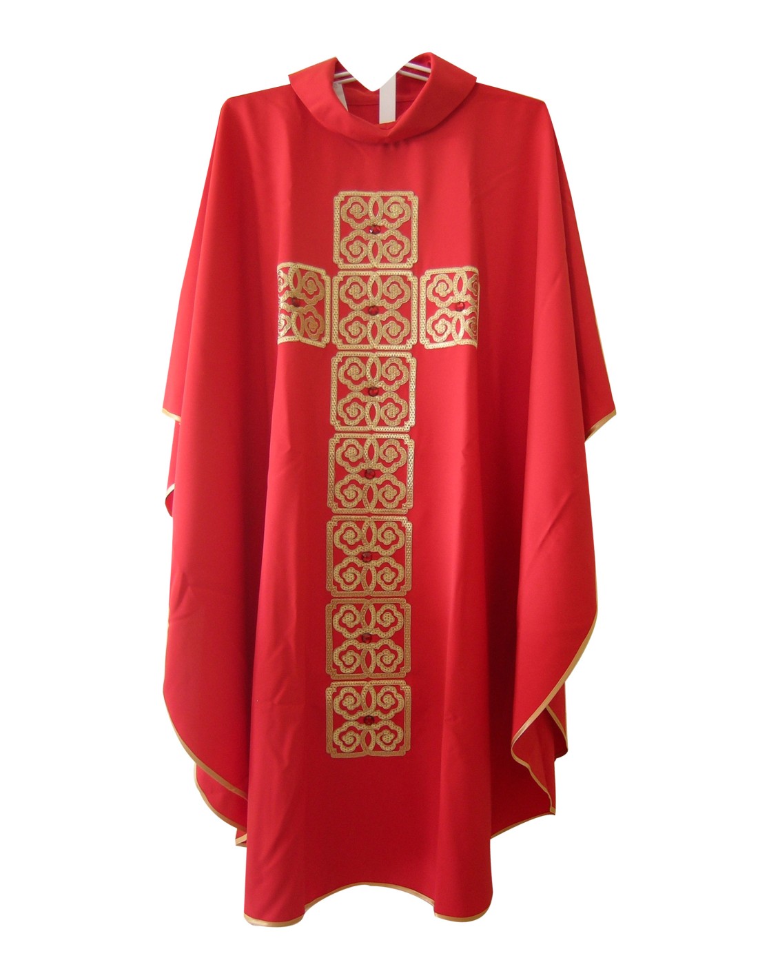 Casulla Bordada Tela Rejilla Blanca Cruz Larga A Cuadrados Con Piedrecitas Roja Kor 079