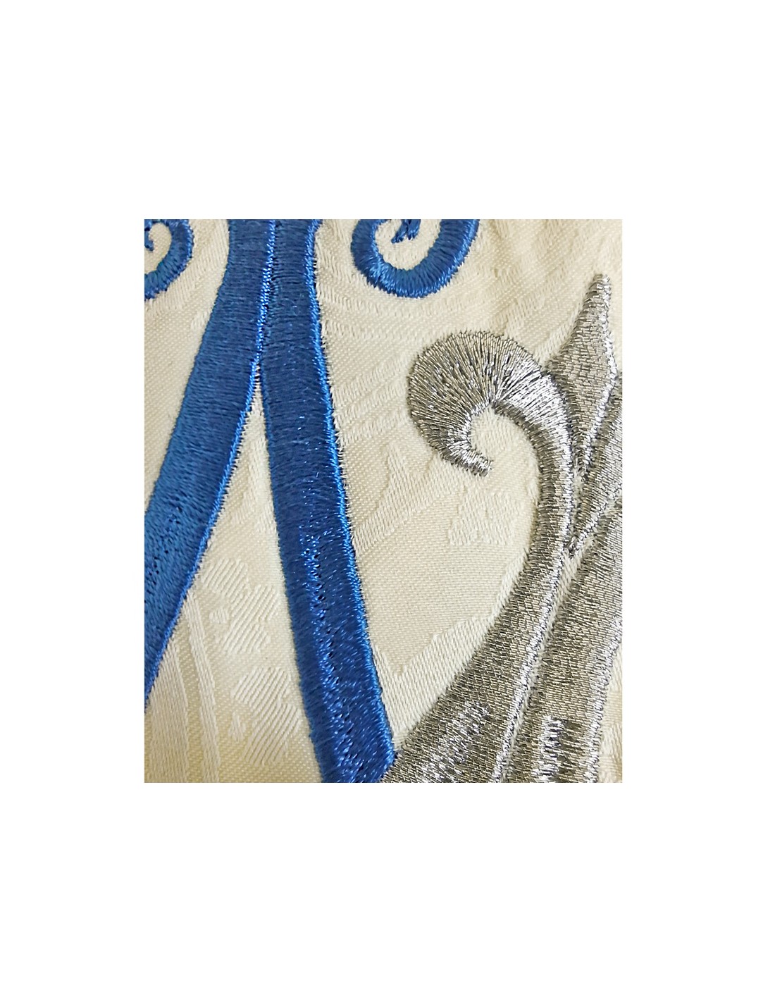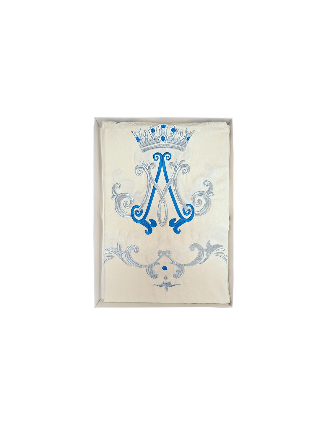 Casulla Adamascada Bordada Mariana Azul Y Plateado Corona Y Cenefa Arriba Y Abajo