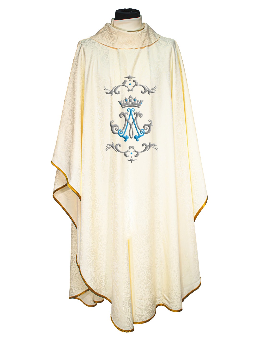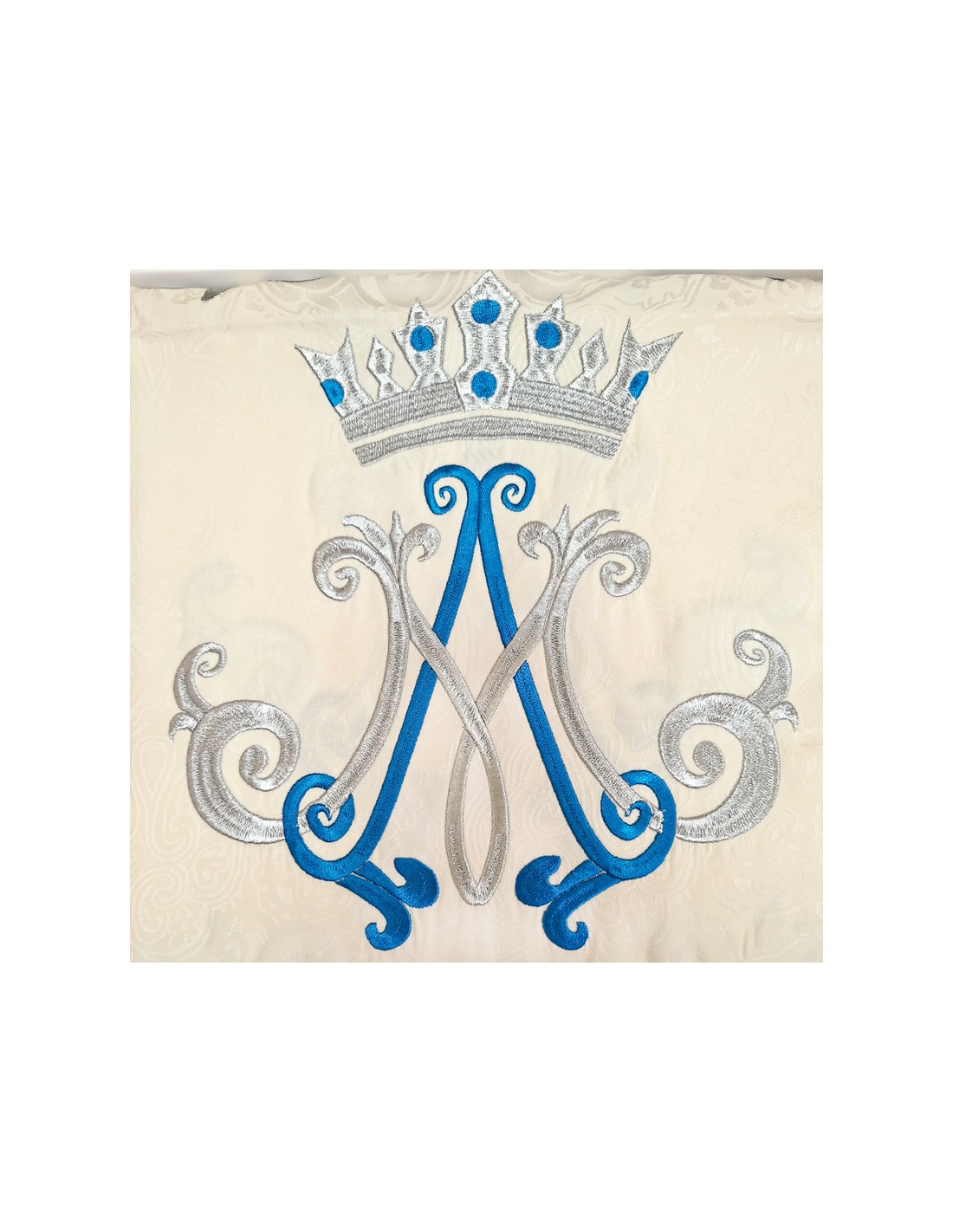Casulla Adamascada Bordada Mariana Azul Y Plateado Corona Y Cenefa Arriba Y Abajo