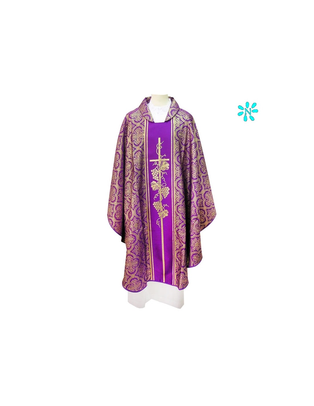 Casulla Estampada Tipo Damasco Morada Con Galon Cruz Larga Racimos Uvas N381