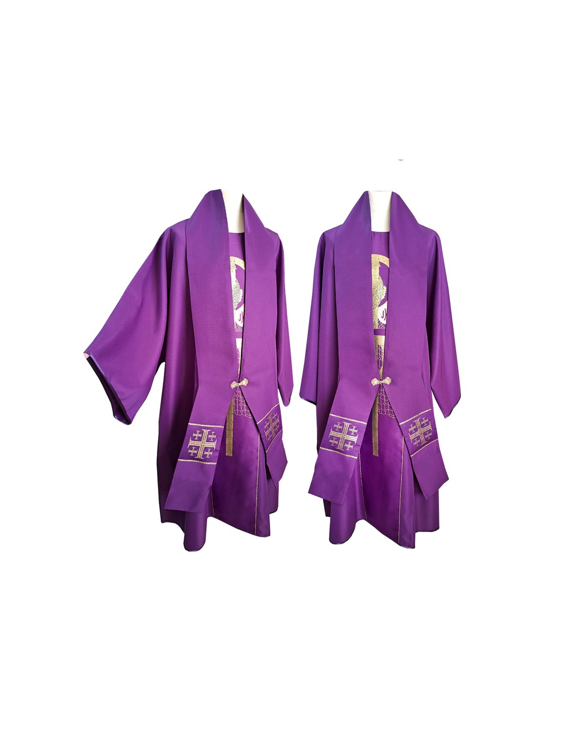 Dalmatica Morada Estampada Con Galon Pax Caliz Forma Y Una Red De Fondo