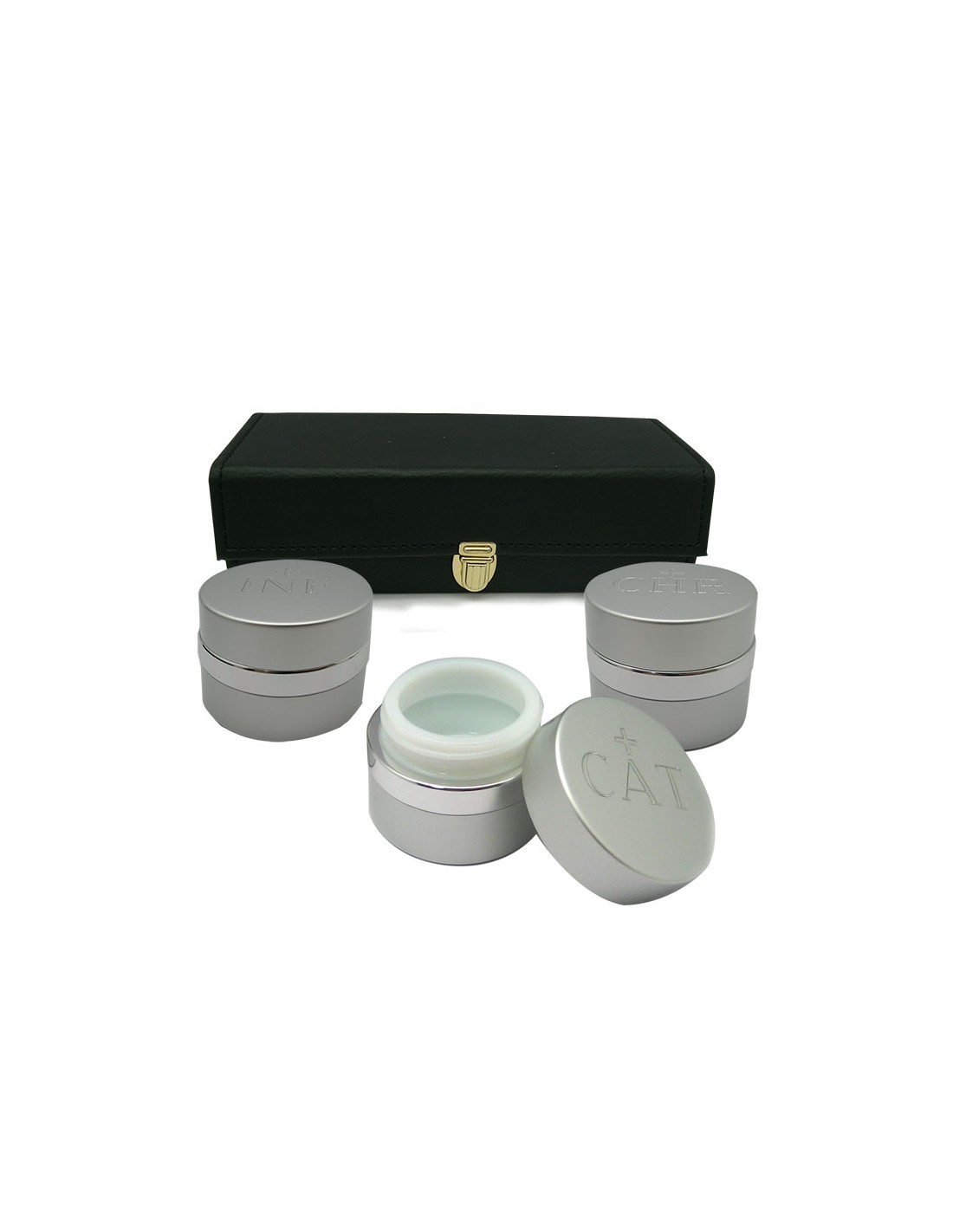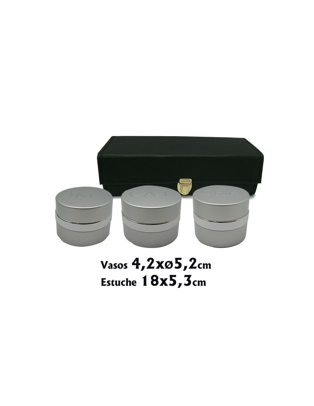 Crismera 3 Vasos Aluminio Plateado Y Cristal Ceramico Interno Estuche Rectangular
