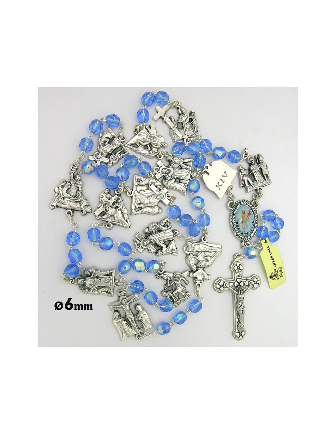 Rosario Cristal Tallado 6Mm Azul Via Crucis Con Estaciones En Metal