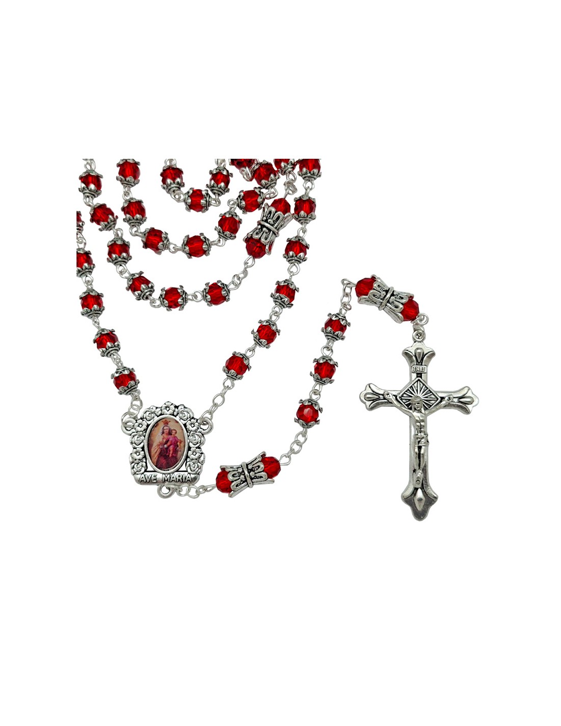 Rosario Cristal Tallado 6Mm Rojo Con Copetas Y Paters Doble Metal
