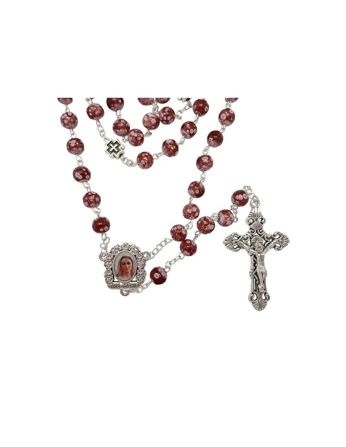 Rosario Cristal 8Mm Marron Con Puntos Celestes Estilo Marmol Y Cruz Metal Paters