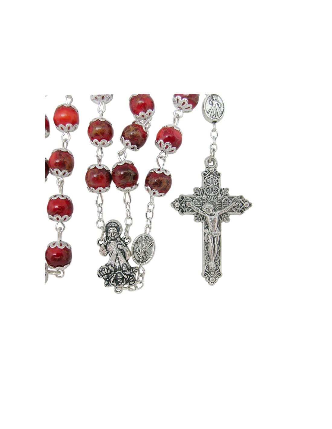 Rosario Cristal Liso 8Mm Divina Misericordia Rojo Con Copetas Y Paters Jesús Misericordioso