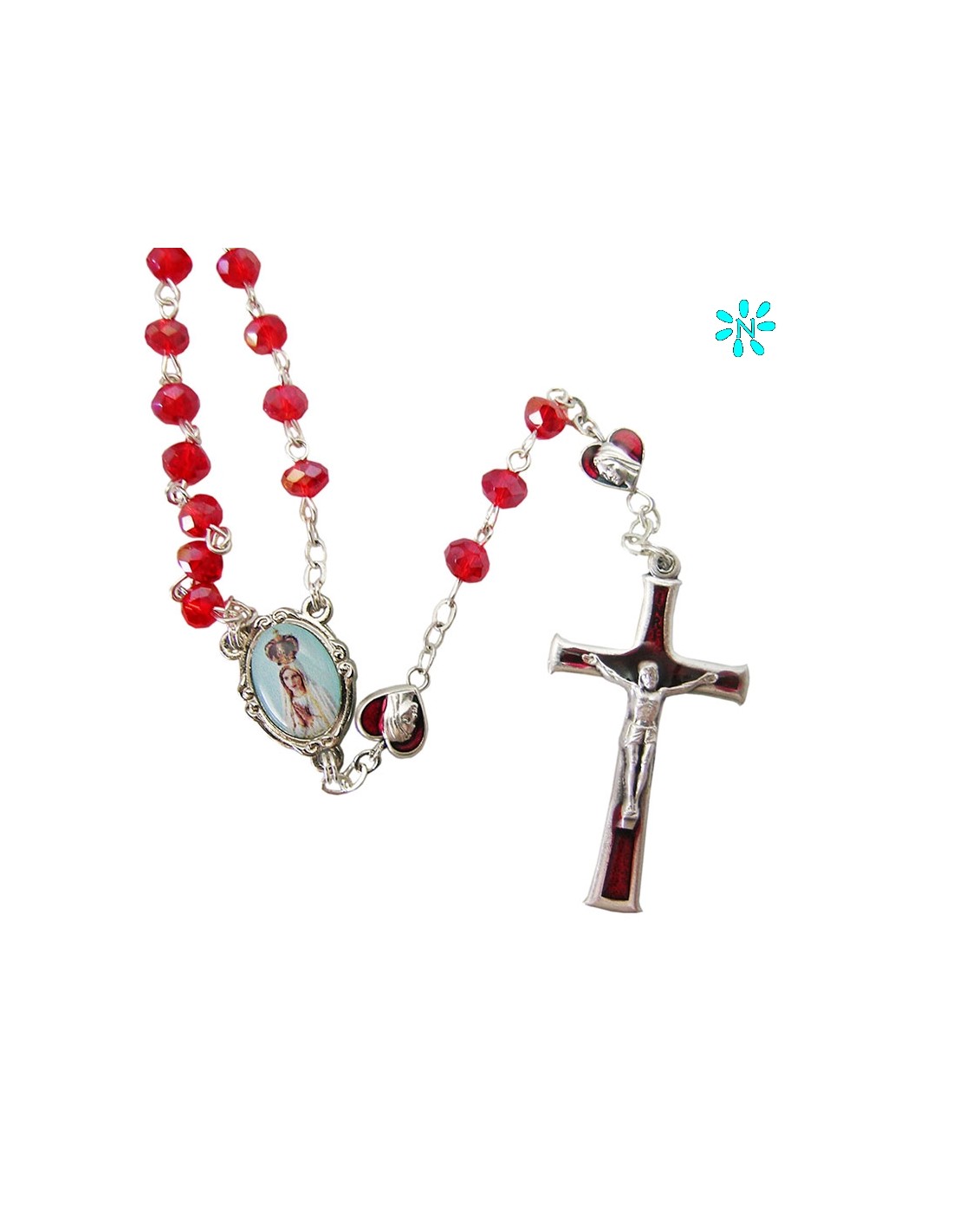 Rosario Cristal Bola Tallada Corazon De Maria Con Cruz Esmaltada Roja