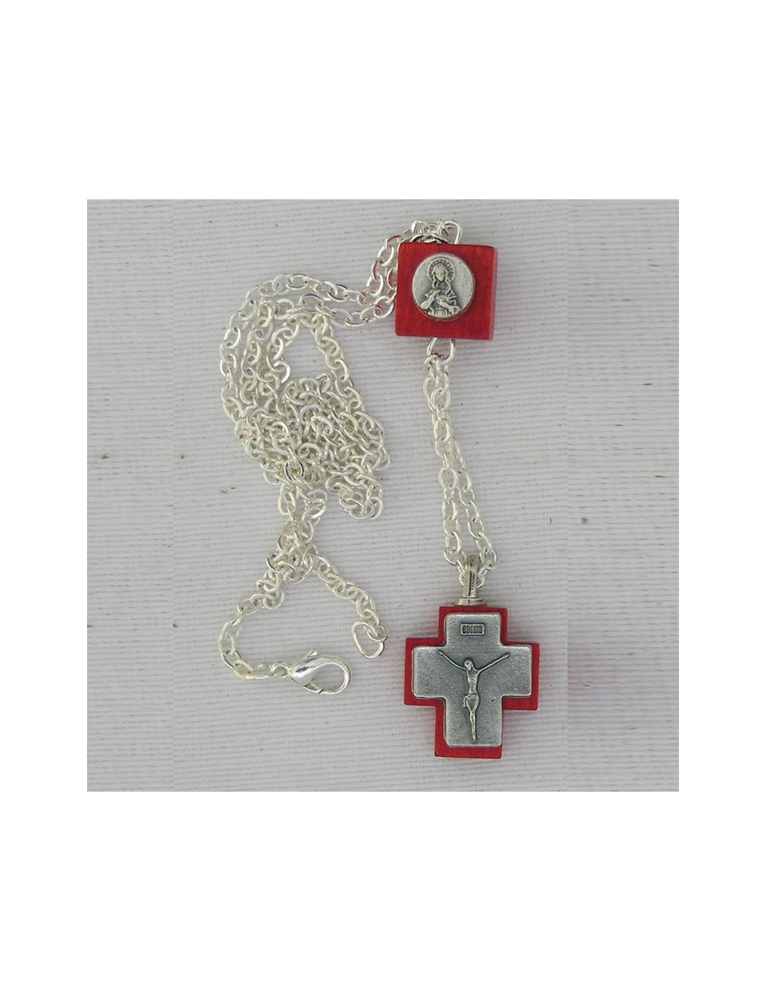 Colgante Madera Rojo Con Cruz Y Medallas Sagrado Corazon De Jesús Y Maria