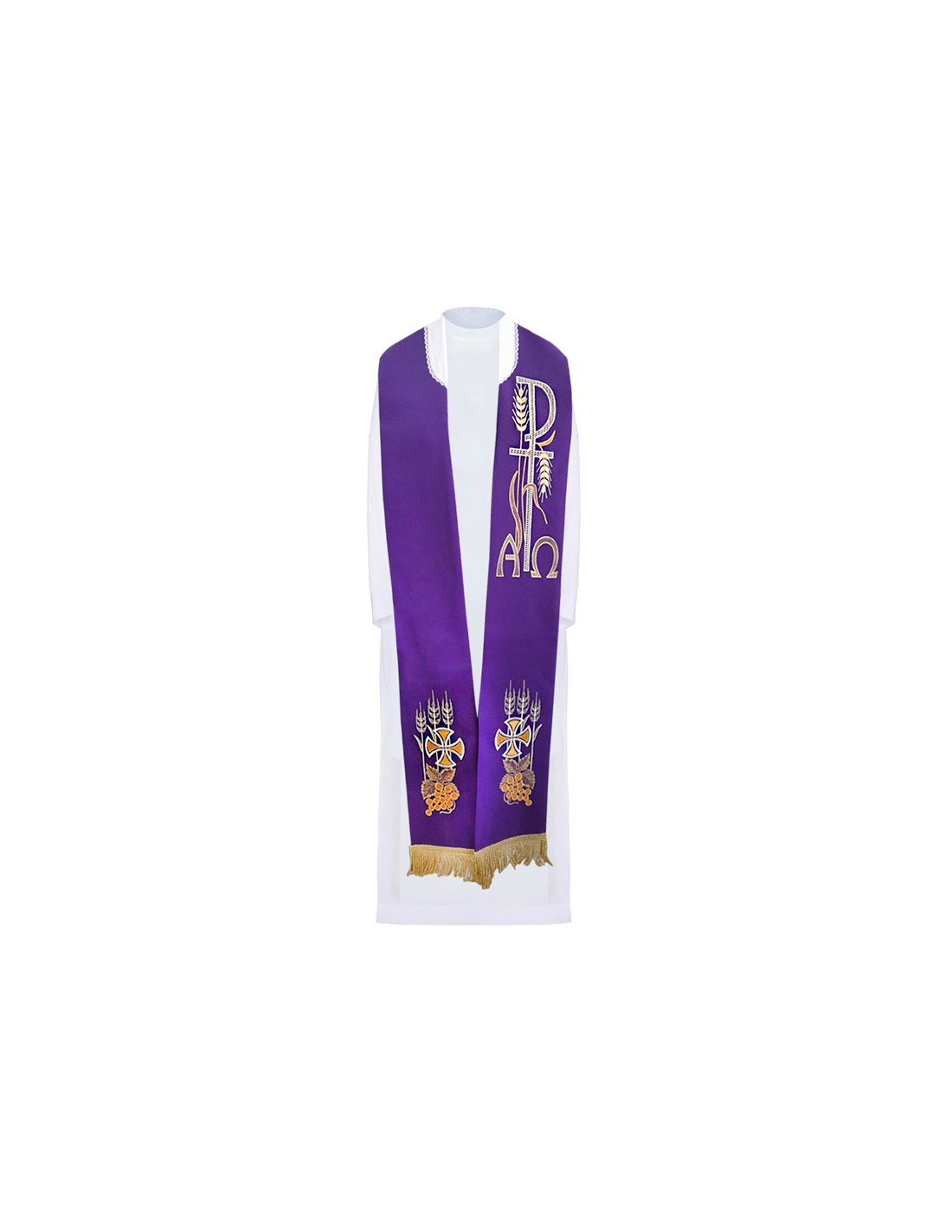 Estola Bordada Ancha Pax Alfa Y Omega Con Cruz Cuadrada 3 Espigas Flecos N133 Morada