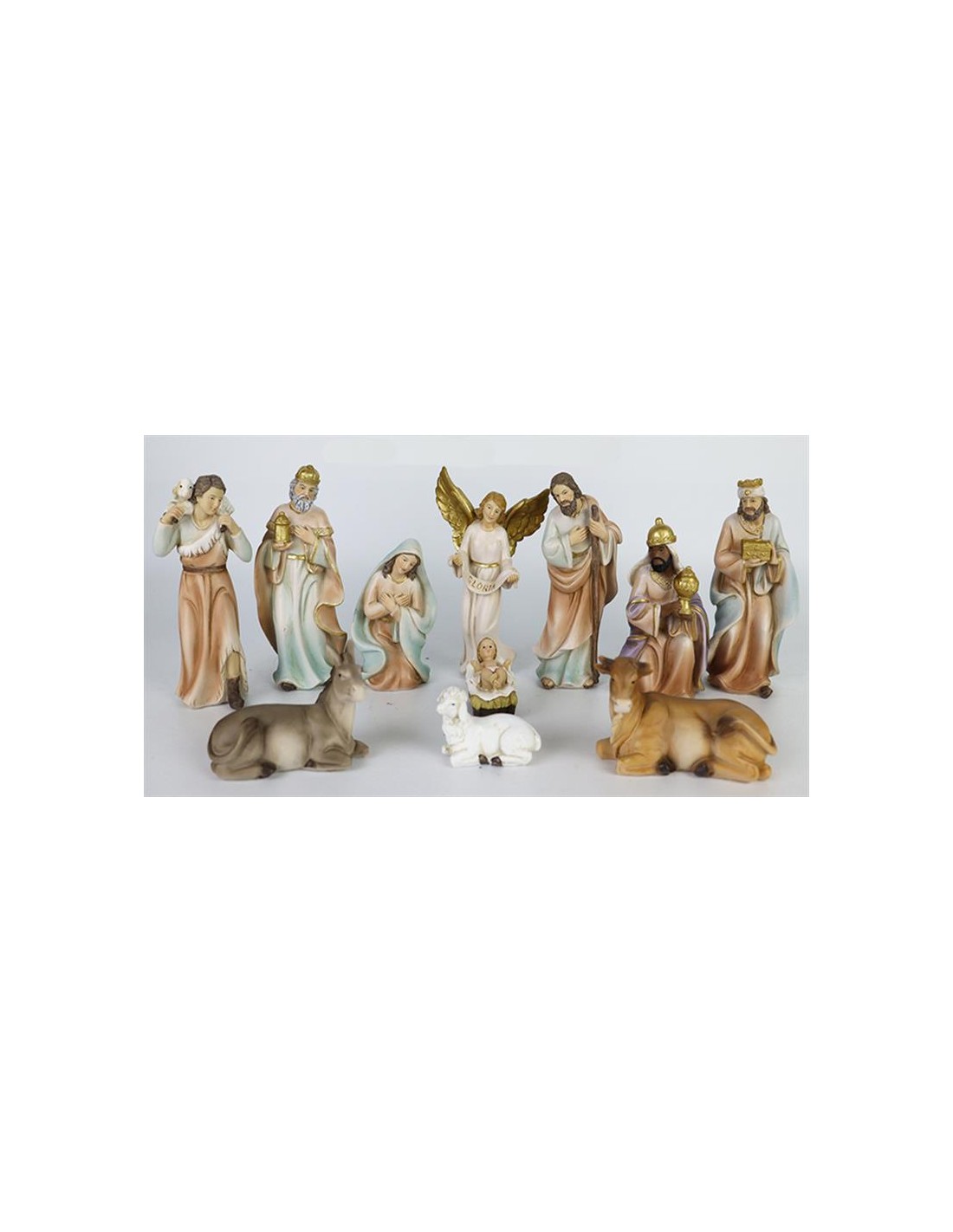 Nacimiento res 16cm 11 figuras PR3 tonos claros angel en pie cartel gloria