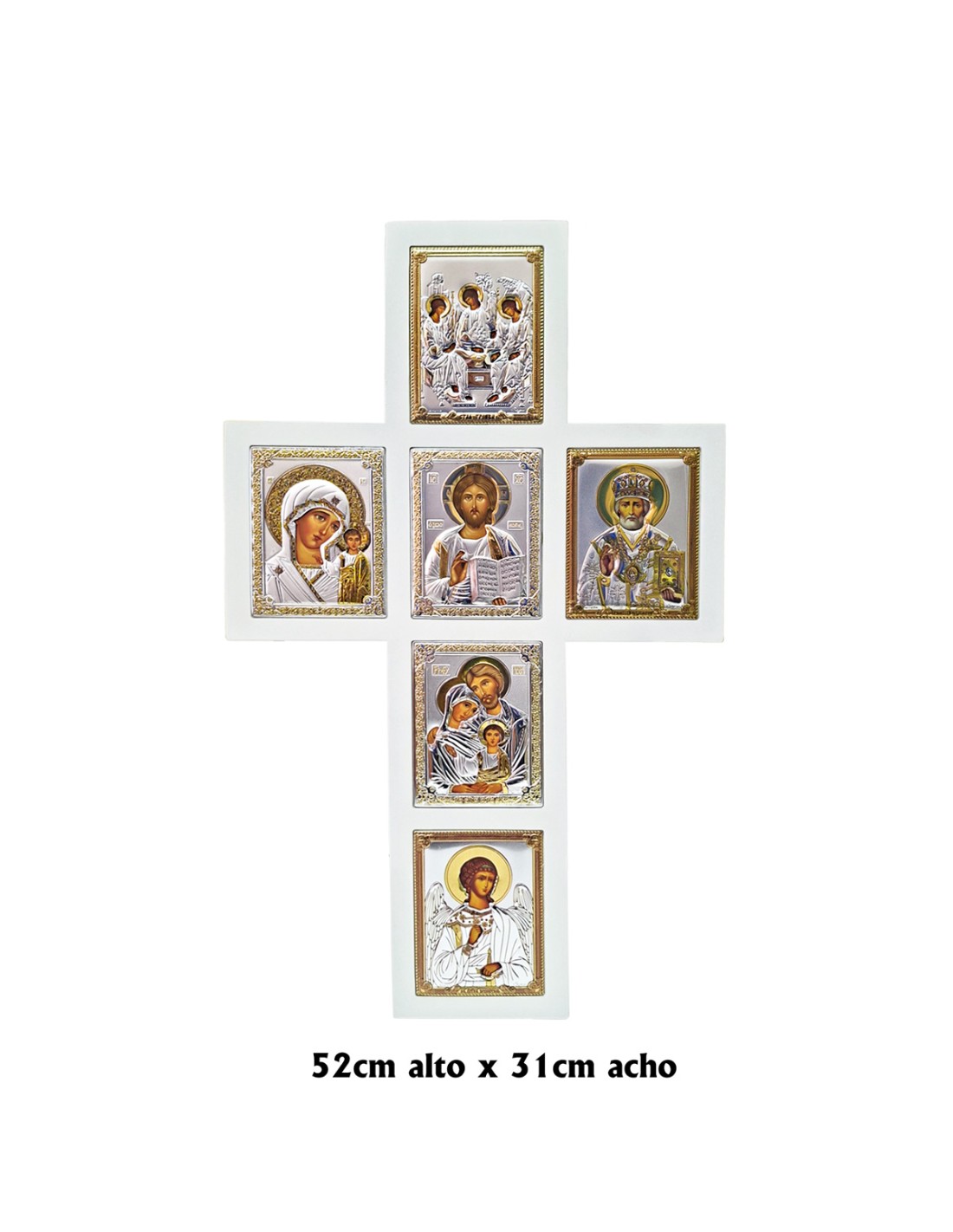 Icono Plata Crucifijo Con Escenas Doradas 52 X 31Cm Madera Blanca