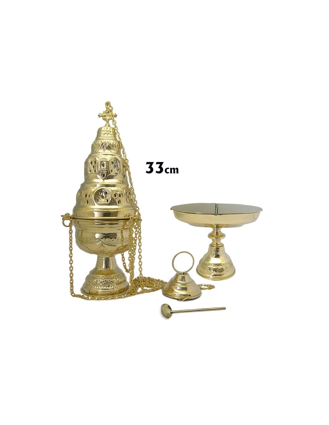 Incensario 33Cm Y Naveta Con Cuchara Dorado Labrado Tres Niveles Mod C1