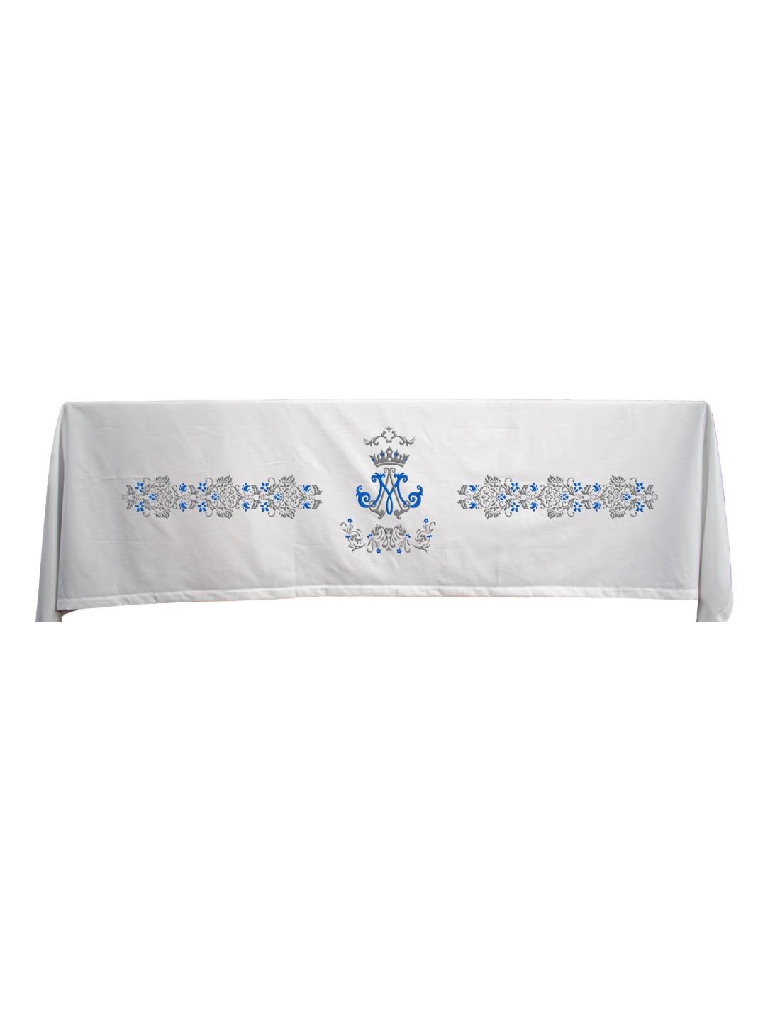 Mantel Altar Bordado 300x160cm Mariano con corona TVA 02 adornos plateados y azul