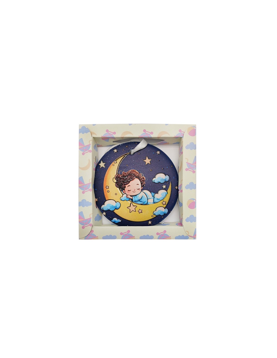 Medalla Cuna Redonda Resina 7Cm Niño Dormido Con Luna De Noche Con Cajita