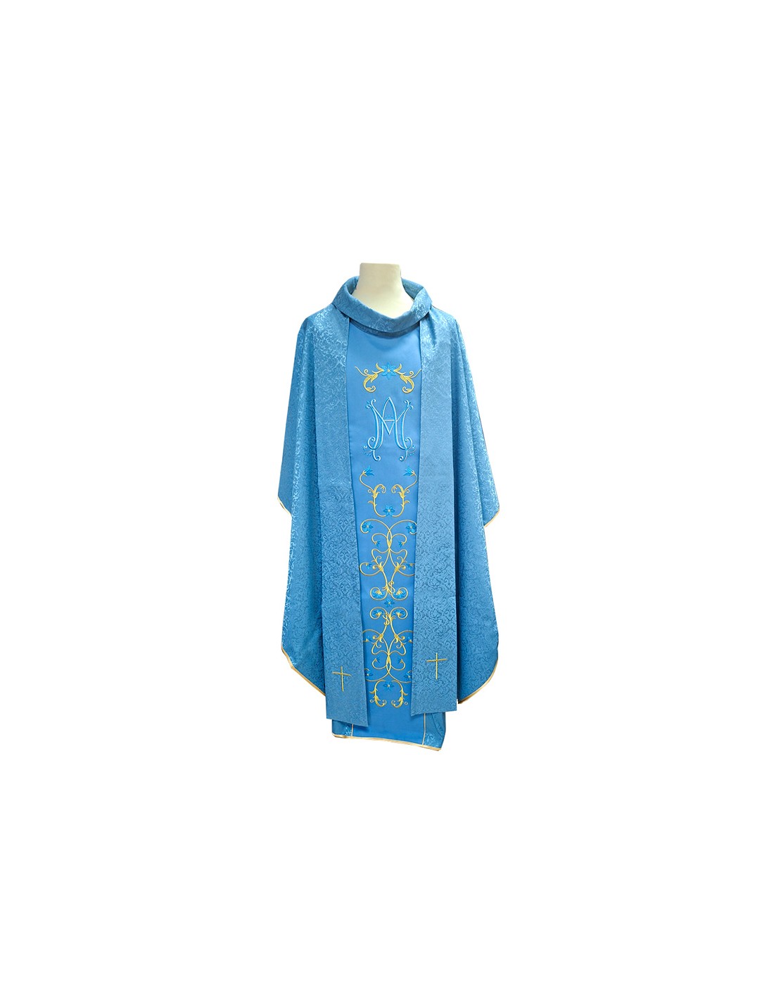 Casulla Bordada Mariana Azul Tela Adamascada Flores Azules Y Dorado Bordado Galon Central