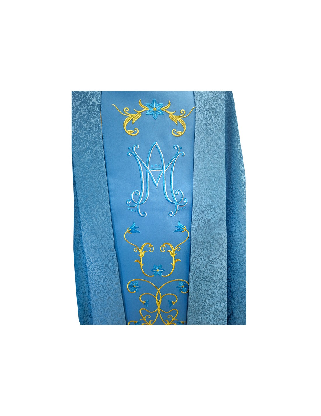 Casulla Bordada Mariana Azul Tela Adamascada Flores Azules Y Dorado Bordado Galon Central