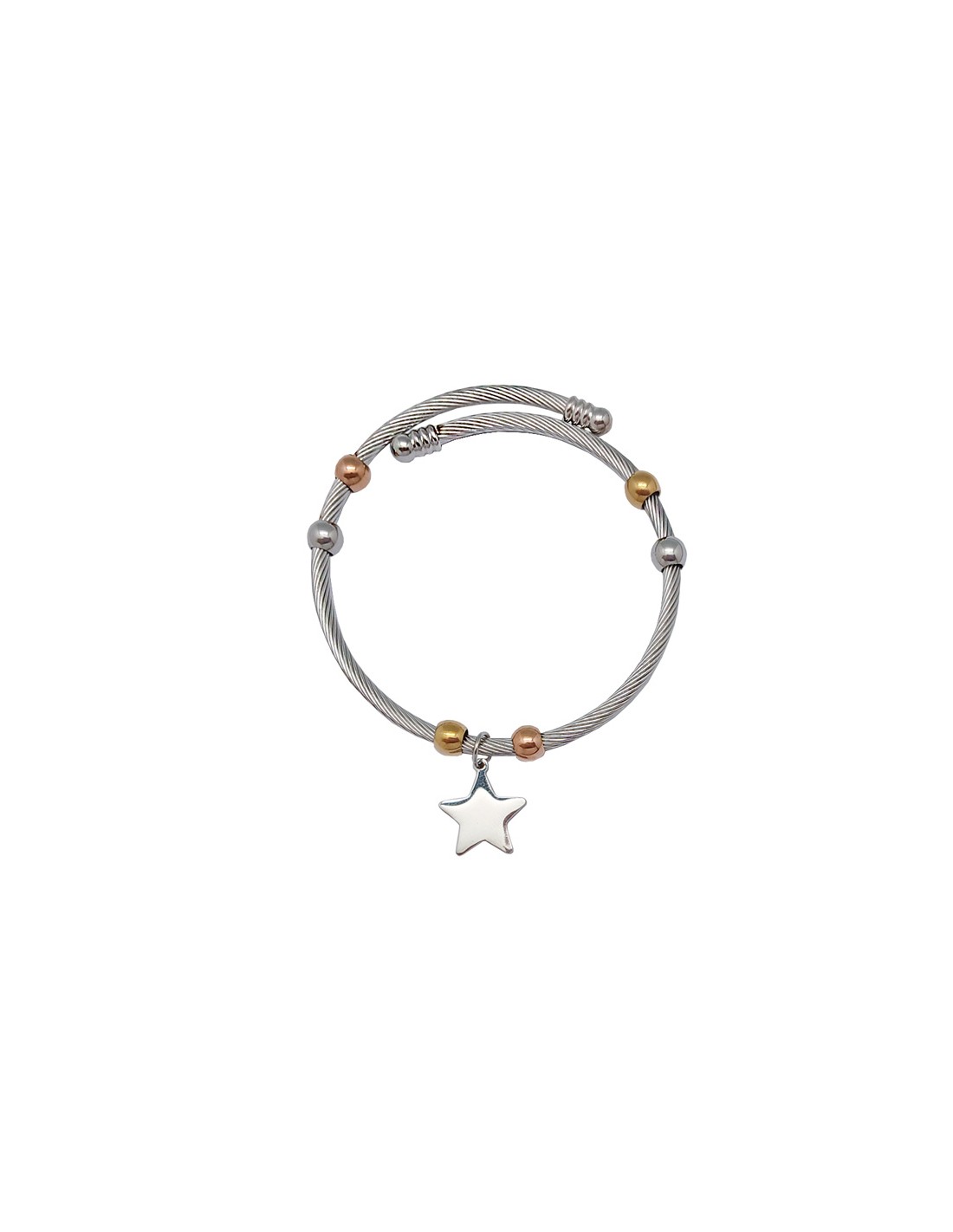 Pulsera Acero Blanco Rayado Con Bolitas Doradas Y Colgante