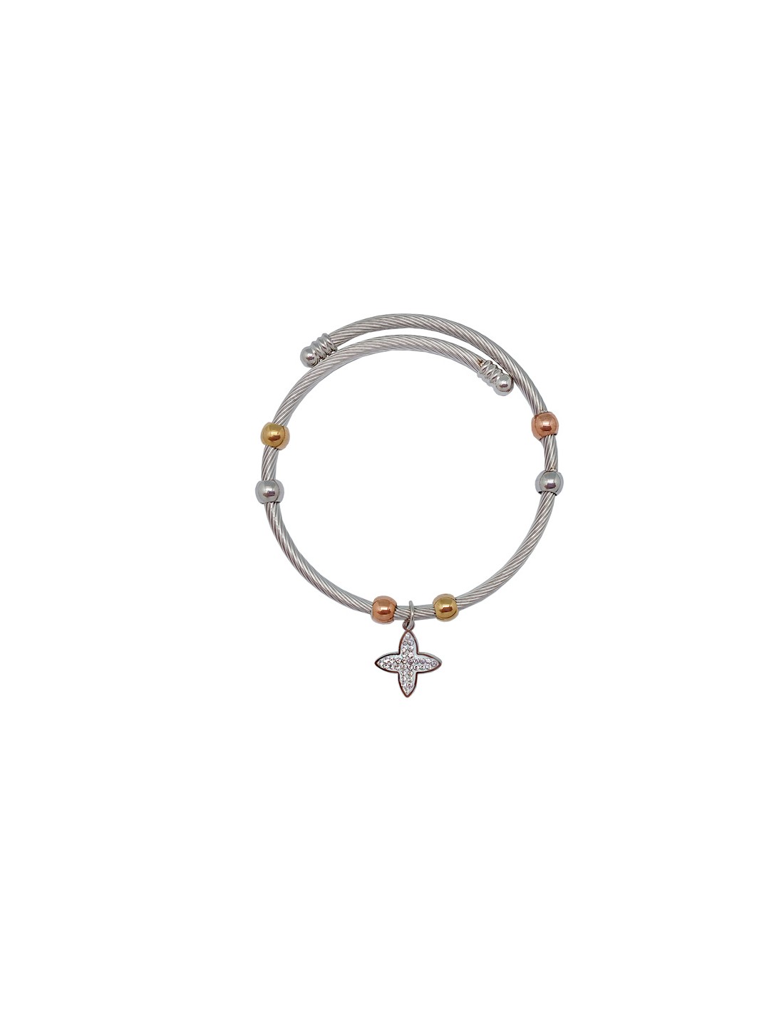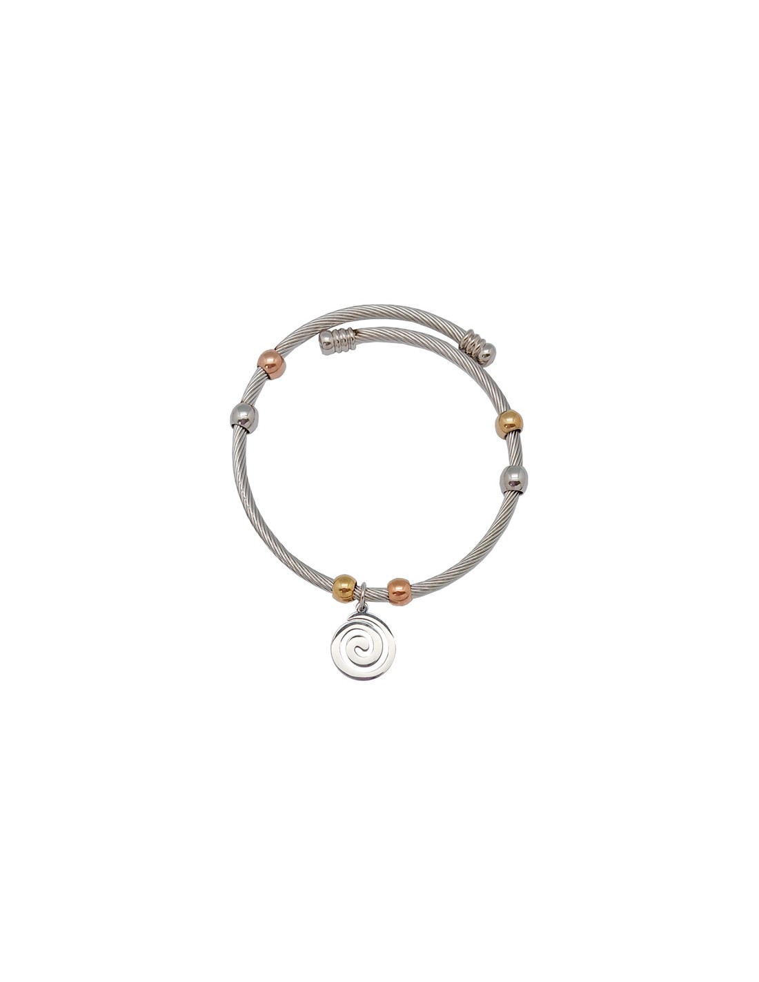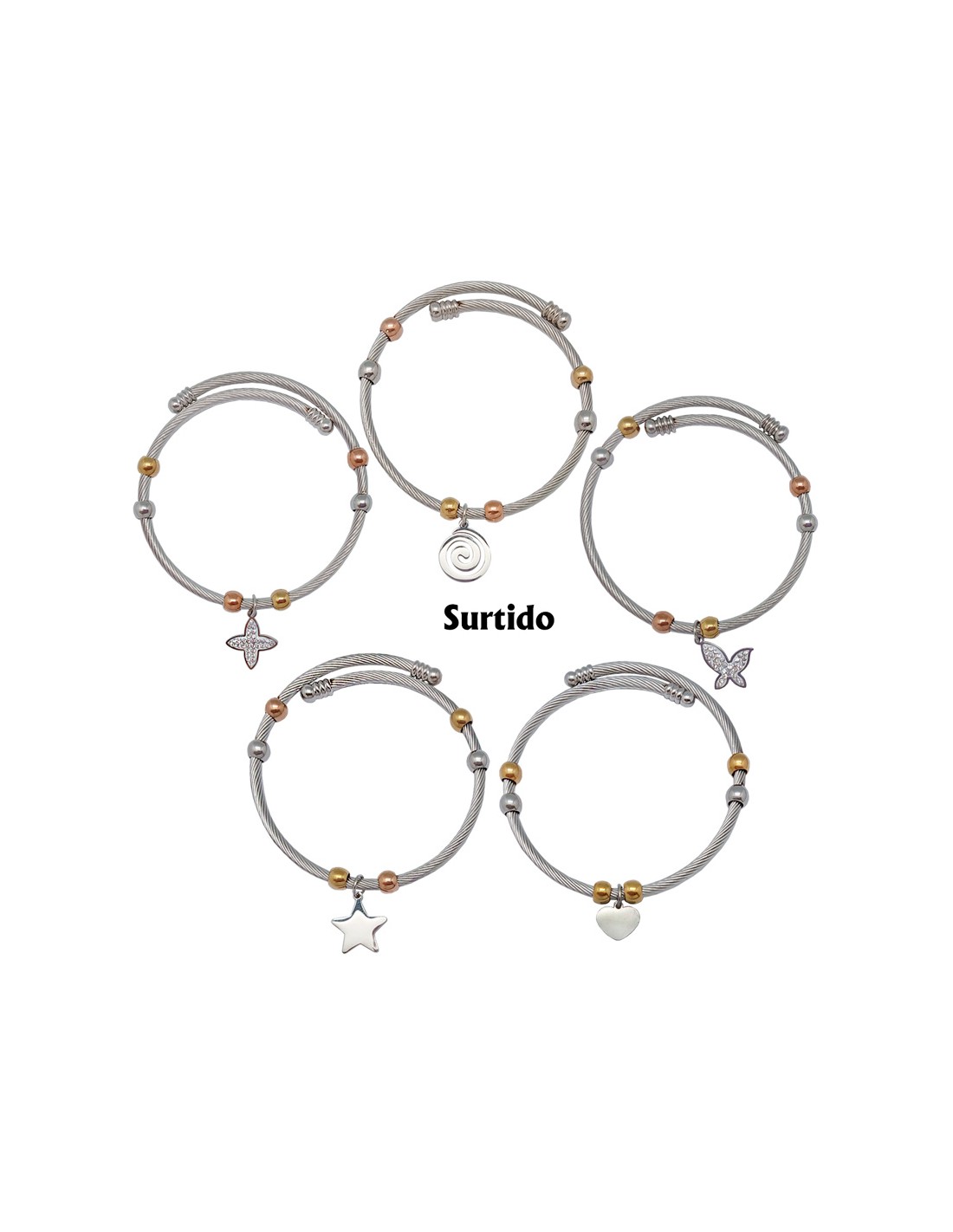 Pulsera Acero Blanco Rayado Con Bolitas Doradas Y Colgante