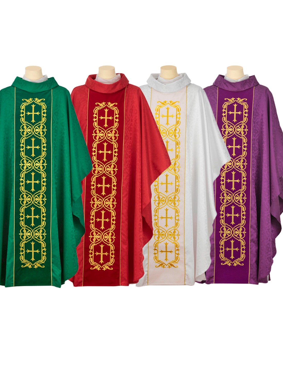 Conjunto 4 Casullas Cinco Cruces Dentro Cenafa Tela Adamascada Sobre Galon Central