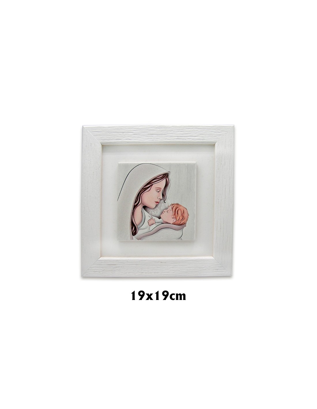 Cuadro Virgen Con Niño 19X19cm Ceramica Blanca