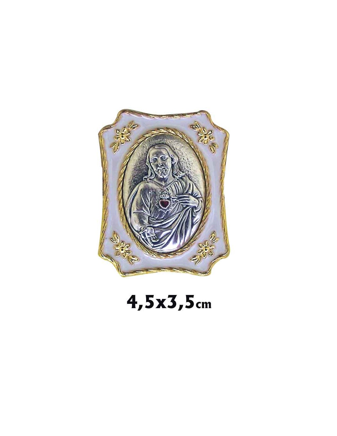 Placa Metal Dorada 4. 5X3. 5Cm Corazon De Jesús En Relieve Con Esmalte Blanco