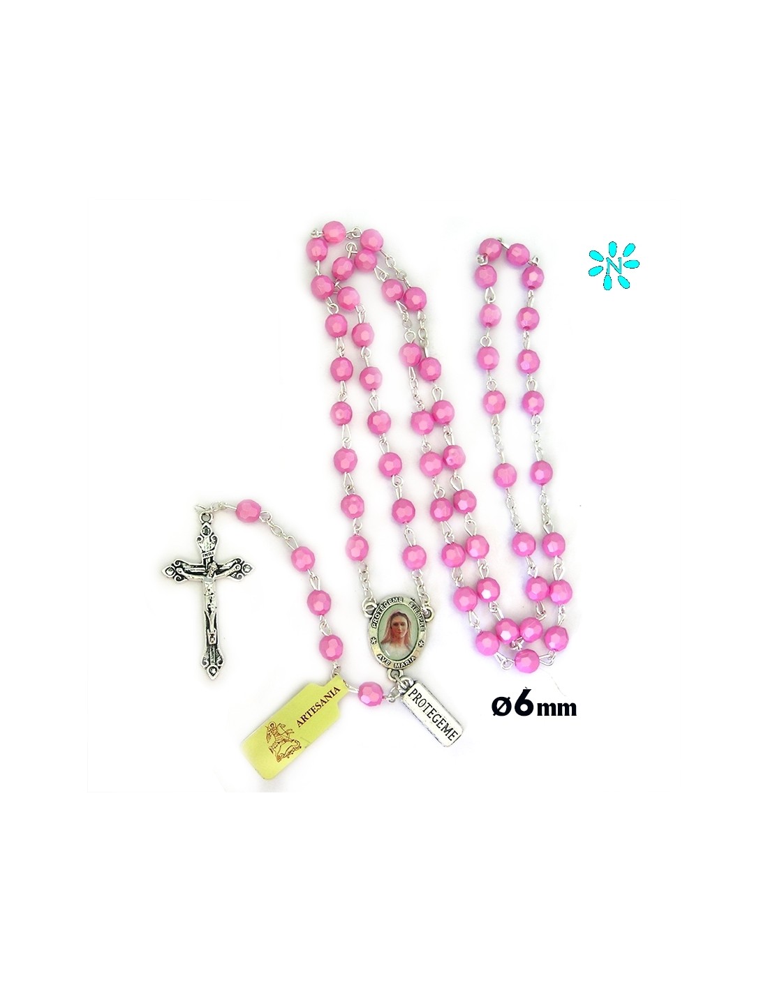 Rosario Plastico Tallado 6Mm Rosa Con Plaquita Protegeme