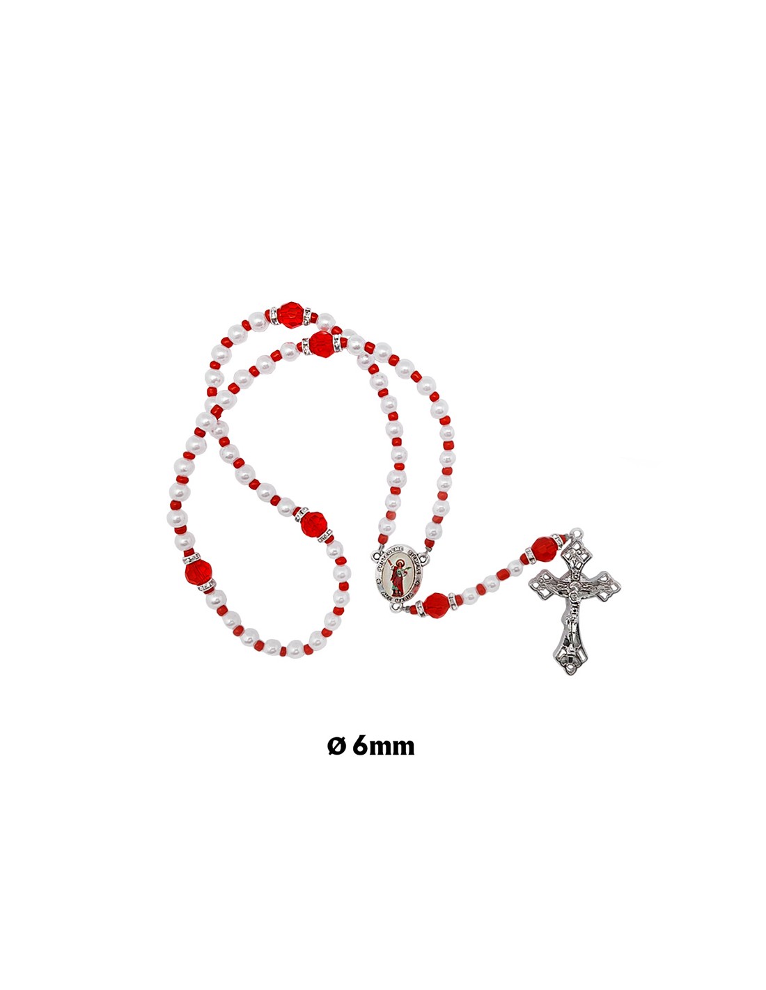 Rosario Plastico Perla Blanca 6Mm Con Paters Cristal Rojo Y Discos Imitacion Zirconitas