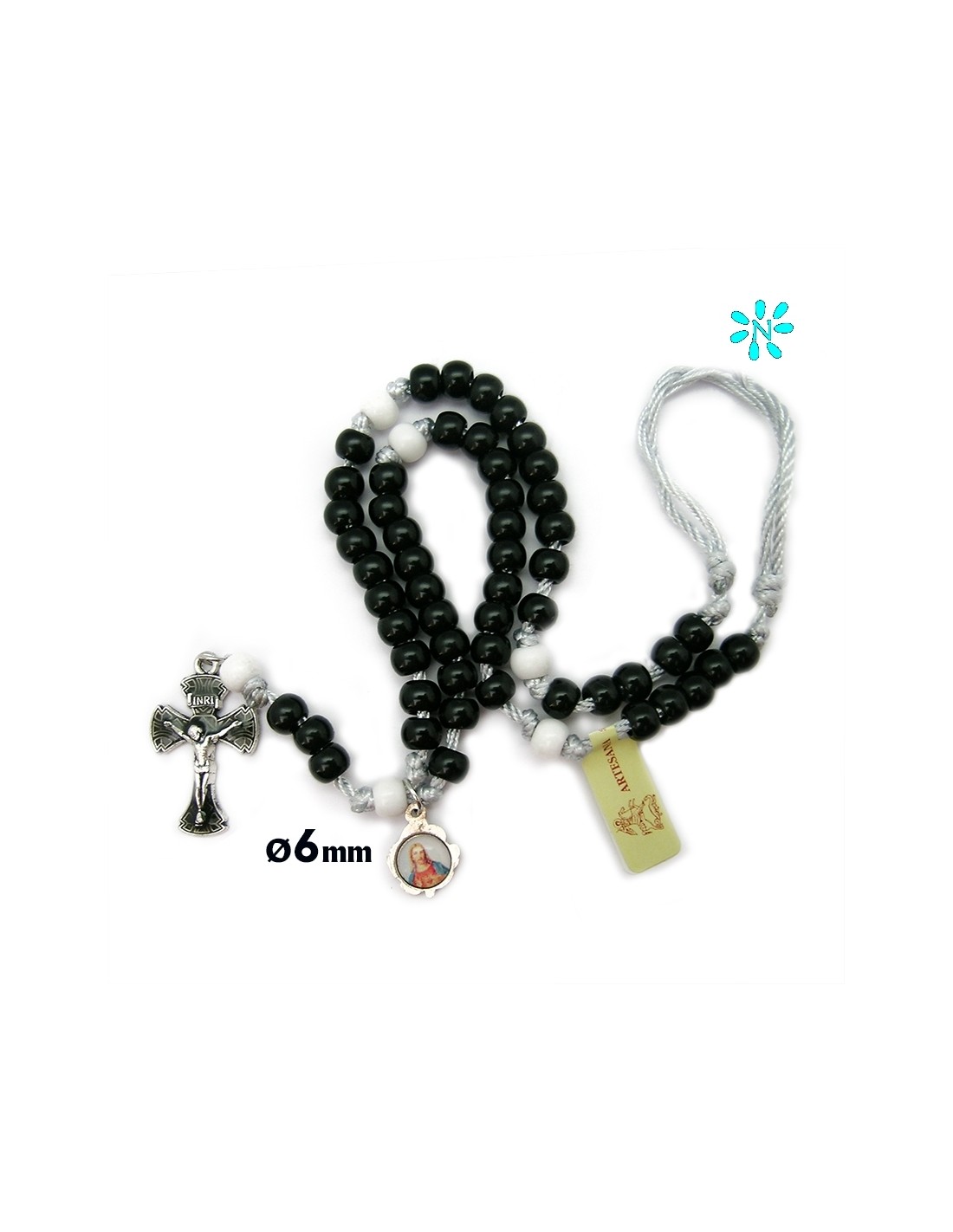 Rosario Plastico 8Mm Negro Cuerda Gris Y Paters Blancos Con Cruz Esmaltada