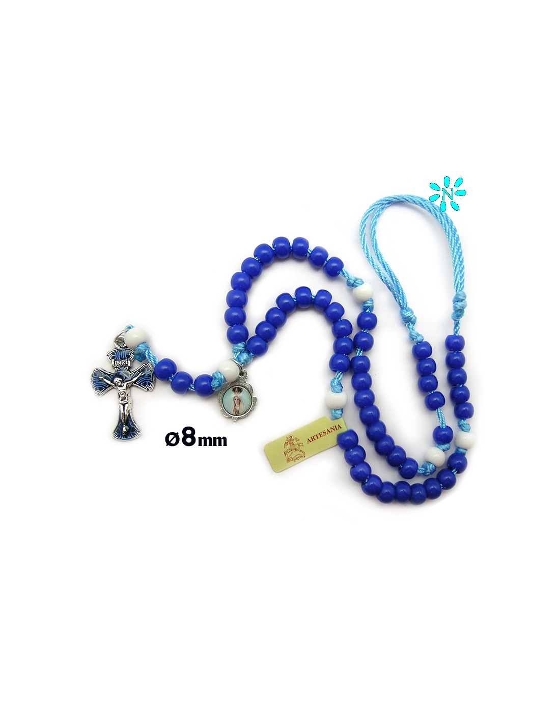 Rosario Plastico 8Mm Azul Cuerda Celeste Y Paters Blancos Con Cruz Esmaltada